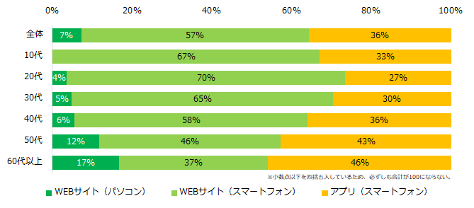求人サイトでお仕事を探す際、主に使うものを伺うと、「WEBサイト(スマートフォン)」(57%)が最多でした。次いで、「アプリ(スマートフォン)」(36%)が続きます。年代別で見ると、60代が「アプリ」と回答した方の割合が一番多い結果となりました。