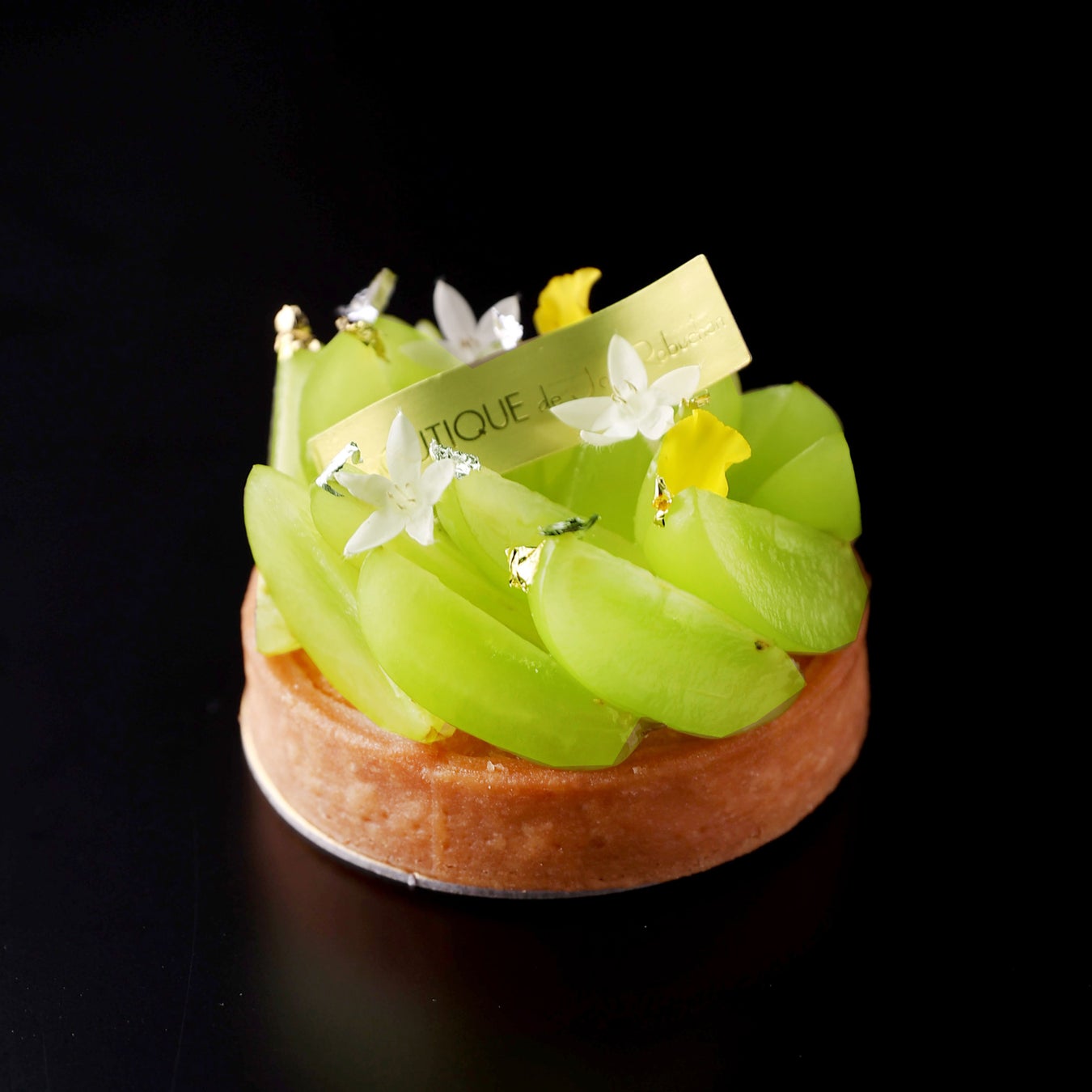 商品詳細 :シャインマスカットをたっぷり飾った期間限定のタルトです。香ばしく焼き上げたアーモンド生地に、カスタードクリームと生クリームを混ぜた軽やかなクリームを重ねています。