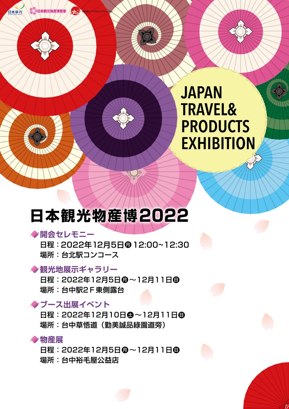 株式会社日本旅行(本社:東京都中央区、代表取締役社長:小谷野悦光)は、台北市および台中市の2都市にて台湾と日本の観光交流促進を目的に開催されるプロモーションイベント「日本の観光・物産博2022」(日時:12月開催/主催:「日本の観光・物産博」実行委員会)に特別協賛します。