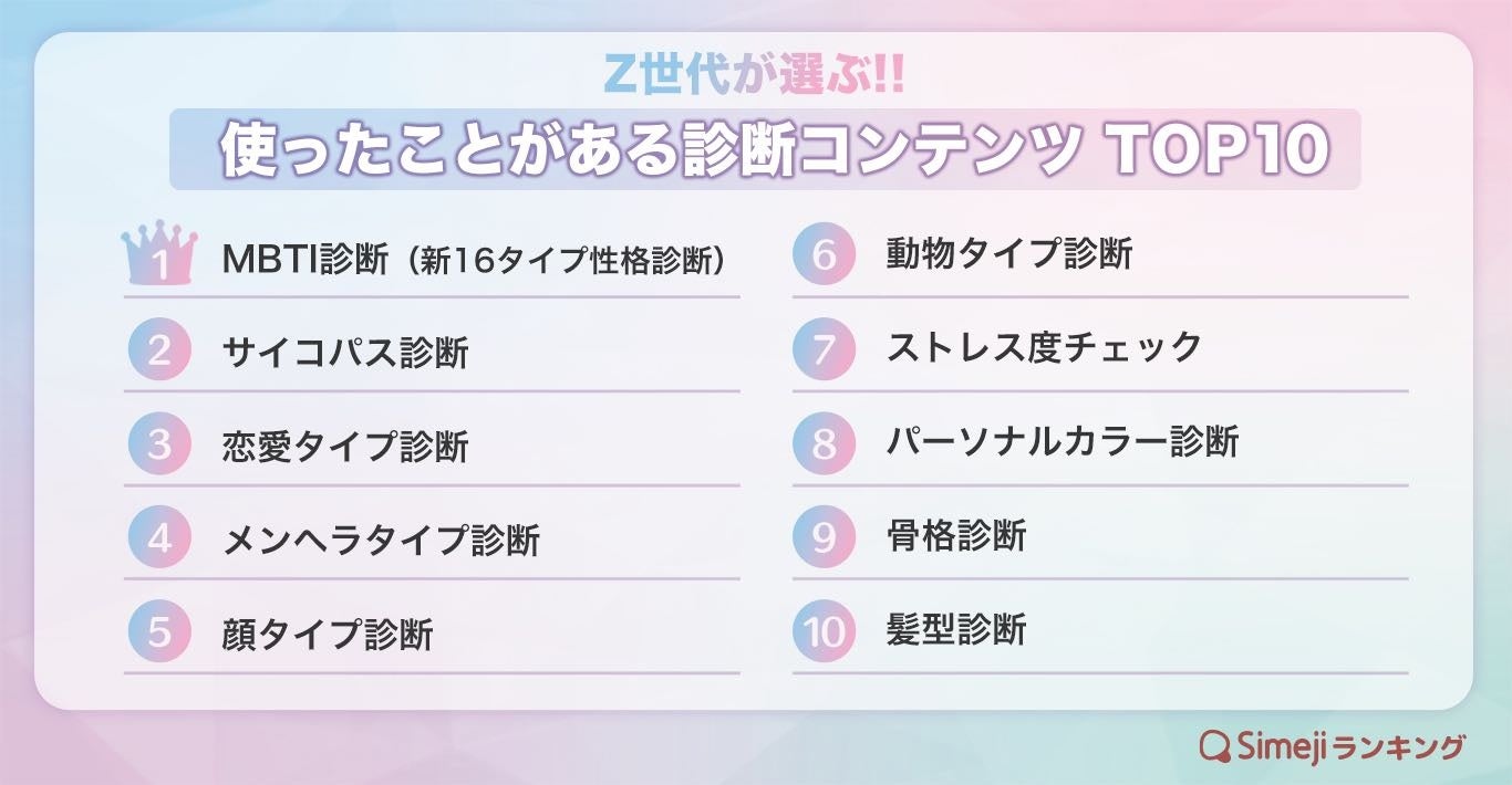 【Simejiランキング】Z世代が選ぶ!!「使ったことがある診断コンテンツTOP10」