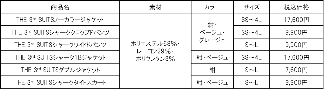 ノッチ・ノーカラー・ダブルの3種類のジャケットとタイトスカート・クロップドパンツ・ワイドパンツなどがそろう「THE 3rd SUITS」は、さまざまなシーンやニーズに対応したアイテムです。細かい凹凸が豊かなニュアンスを加える無地調のシャーク素材はオケージョンほか、ビジネスシーンでも活躍します。コサージュなど、特別な日に華を添える小物も多彩にご用意しております。