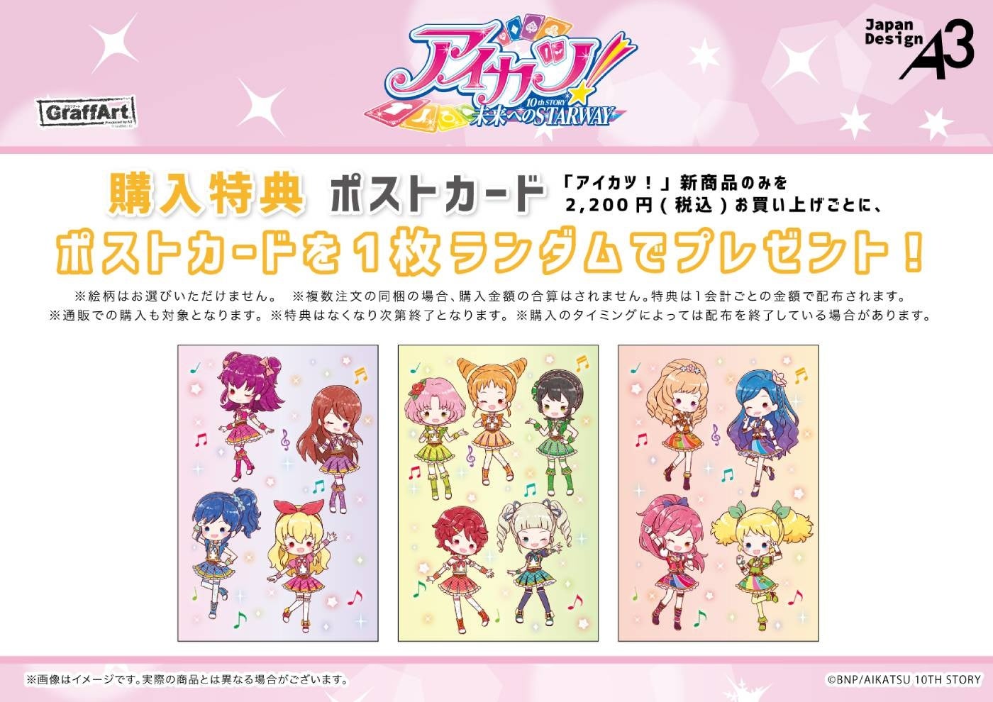 今回発売したアニメ『アイカツ!』の新作グッズを2,200円(税込)お買い上げごとに、ポストカード(全3種)をランダムで1枚プレゼントします。