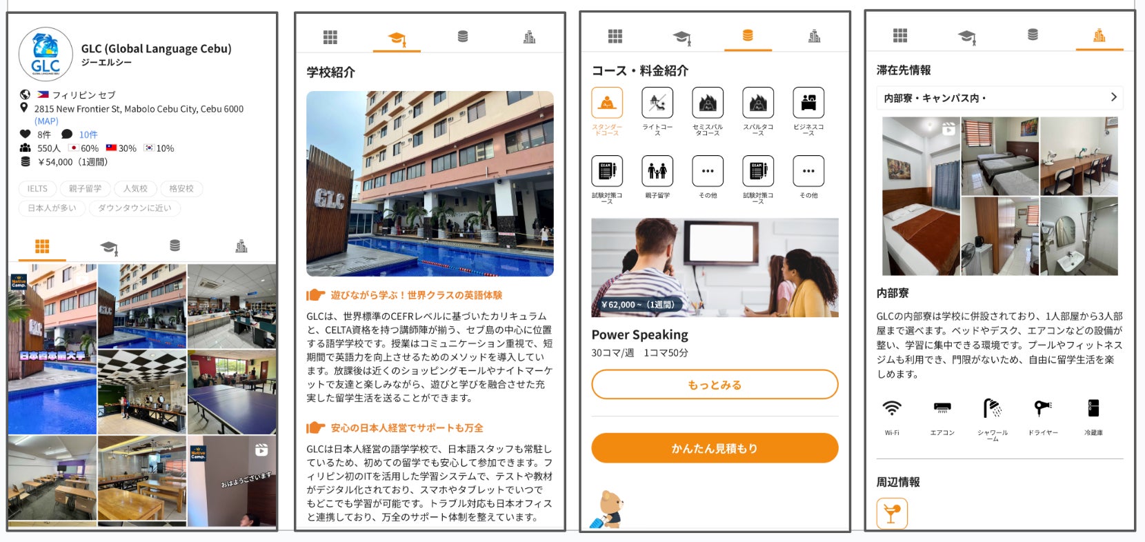 ネイティブキャンプ留学では、ユーザーが情報を分かりやすく把握できるよう、常に丁寧な情報提供を心がけています。GLCの詳細情報は、以下の4つのカテゴリーに分けて掲載しており、知りたい情報を的確にお届けします。