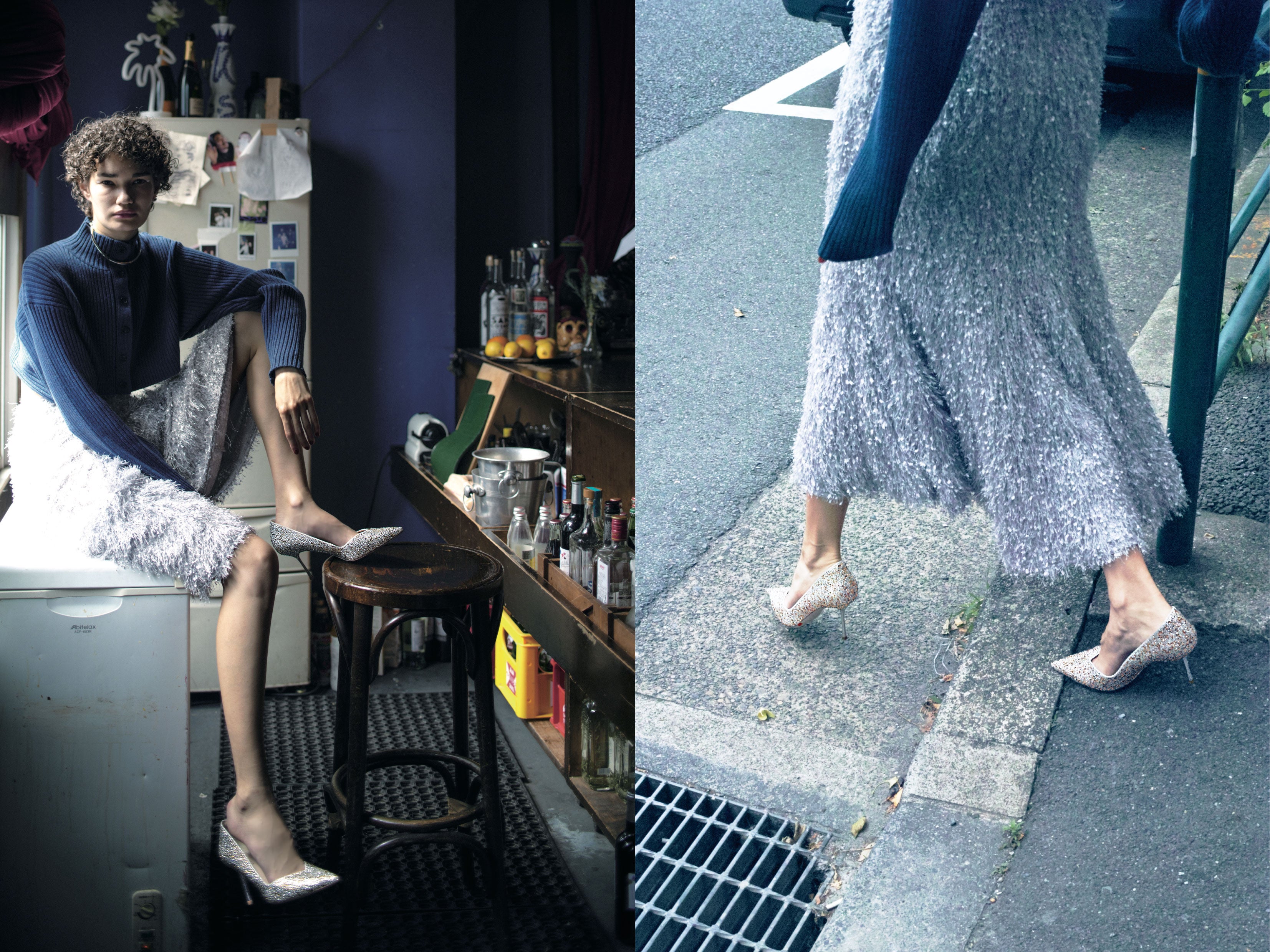 華やかなビジューや季節感じるツイードやチェック柄デニム素材に、クラシックなローファーなど、エレガント且つ洗練された、フューチャリスティックなアイテムに合わせ、カタログではあえてレトロムードなデザインや遊び心のあるカットを差し込むことで、秋の足元を彩る靴の魅力を引き出す構成になっています。