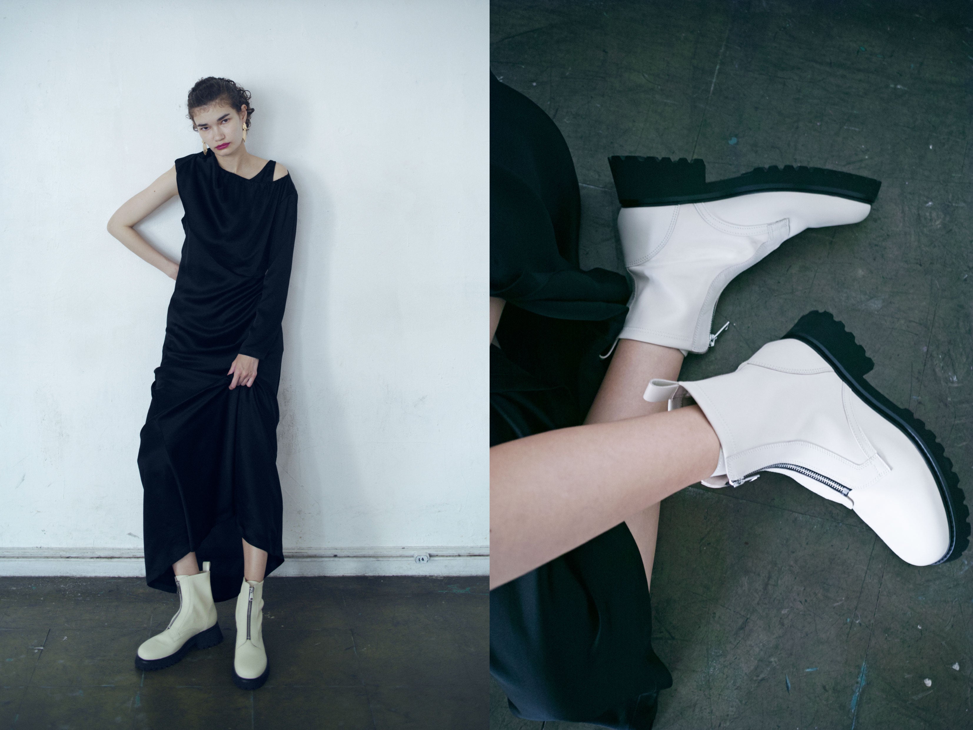 優しいホワイトカラーにラグソールで、カジュアルでありながらモードな印象に。