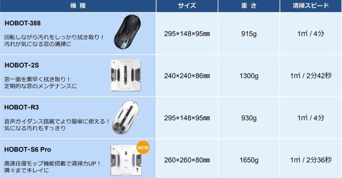 ※税込価格:HOBOT-388(33,800円)、HOBOT-2S(39,420円)、HOBOT-R3(41,220円)、HOBOT-S6 Pro(53,800円)