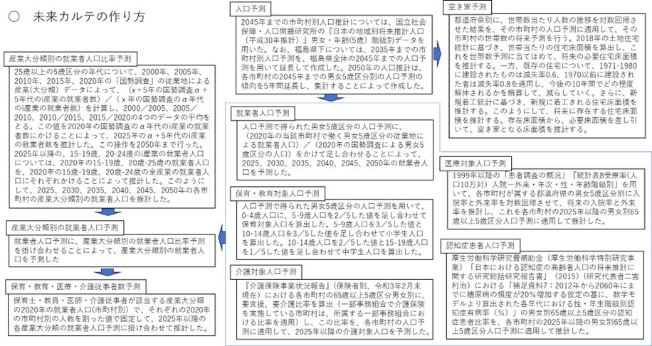「未来カルテ」とは、人口減少や高齢化に対して何も対策せず、現在の傾向が継続した場合の、産業構造、保育・教育や医療・介護の状況、公共施設・道路や農地などの維持管理可能性、住宅の供給可能性、再生可能エネルギーによる自給可能性などの分野について、将来の状況をシミュレートして数値で視覚化するプログラムです。