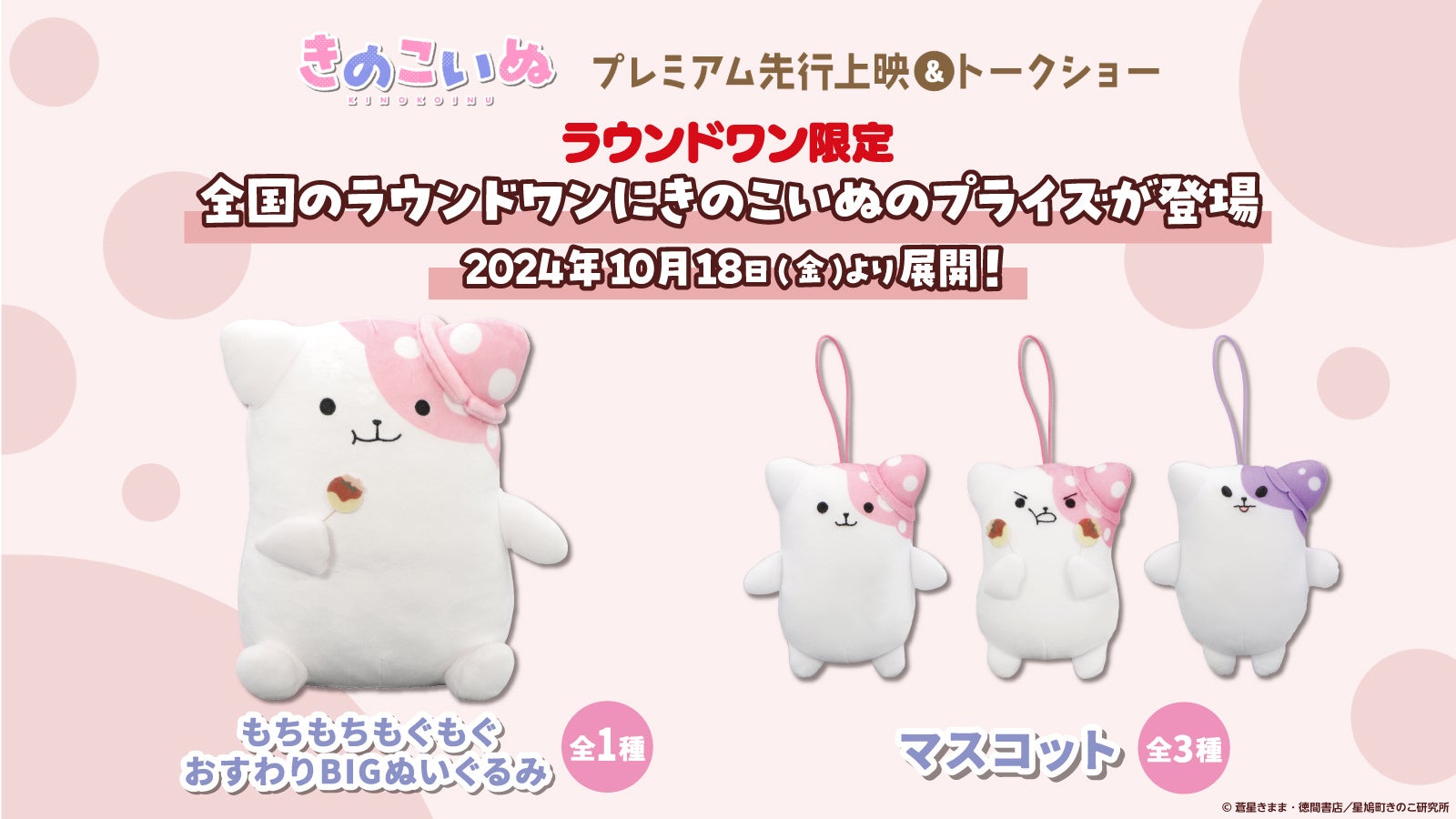 きのこいぬのアミューズメント専用景品(プライズ)を10月より、ラウンドワン限定で順次展開します。今回登場するのは、「もちもちもぐもぐおすわりBIGぬいぐるみ」(全1種)と「マスコット」(全3種)の2アイテム。