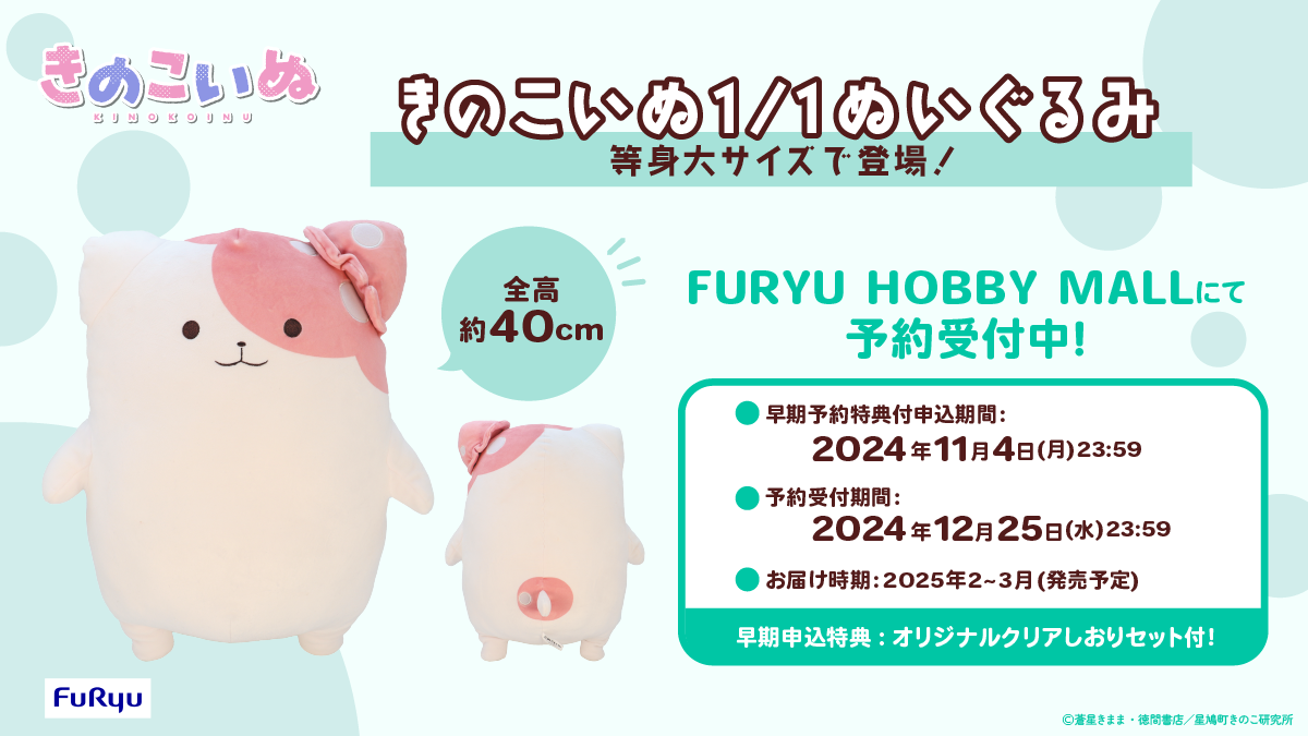ホビーECサイト『FURYU HOBBY MALL』にて、「きのこいぬ1/1ぬいぐるみ」の予約販売を開始いたしました。等身大のきのこいぬぬいぐるみは、ふわふわもちもちの生地で抱き心地もバツグン。愛らしい表情はもちろんきのこの耳やしっぽなどついつい抱きしめたくなる可愛さも魅力です。
