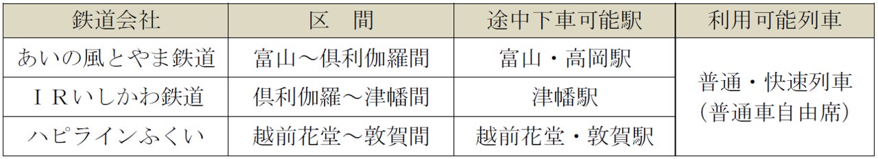 ・氷見線・城端線・七尾線・越美北線をご利用の場合、「あいの風とやま鉄道」「IRいしかわ鉄道」「ハピラインふくい」の以下の区間は、特例としてJR線へ通過利用する場合に限りご利用いただけます。(「IRいしかわ鉄道」の津幡~金沢間は特急列車もご利用いただけます。)※ 途中下車可能駅以外の駅で下車した場合(区間内での下車、区間を越えた乗車等)は、別に全乗車区間の運賃が必要です。