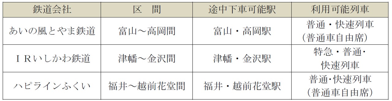 ・2024年3月16日乗車分以降、金沢~敦賀間(「IRいしかわ鉄道」「ハピラインふくい」)はご利用になれません。ご利用の場合には別途、ご利用になる区間に有効な乗車券類が必要となります。