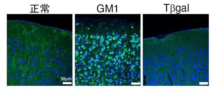 ・GM1ガングリオシドーシスモデルマウスに対して治療を行い、生化学的・病理学的・行動学的に有効性を実証しました。