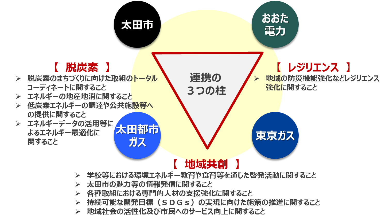本協定では、市の現状を把握して課題を共有した上で、市域の新電力会社であるおおた電力による地産電力の安定供給力、太田都市ガスの地域ネットワーク力、そして、東京ガスが培ってきたノウハウや先進技術を活用することによって、課題に対するソリューションの提案を受けることが可能となり、脱炭素のまちづくりに向け、更に前進できるものと考えています。