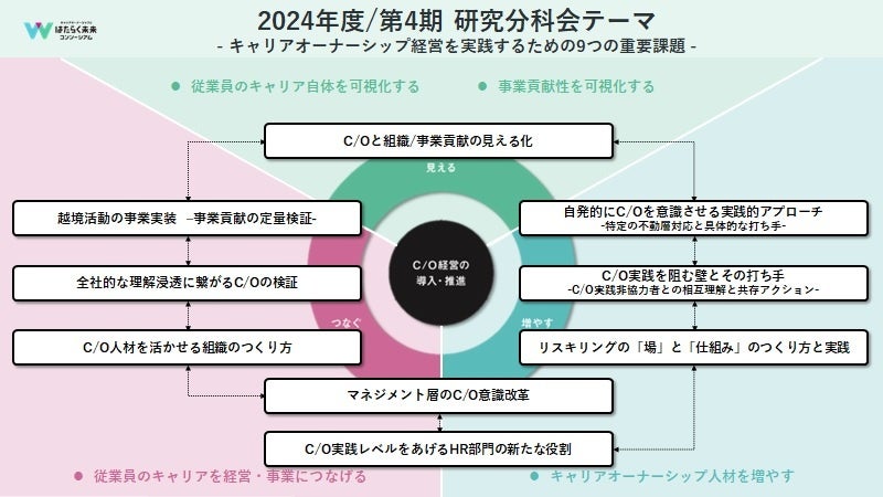 キャリアオーナーシップ人材を事業成長の力に変える「個人と企業が共に成長しあう新しい関係性」を模索する企業・団体が業界を越えて集まり、その実践論について議論・実践・検証を行う「キャリアオーナーシップとはたらく未来コンソーシアム」< https://co-consortium.persol-career.co.jp/ >では、第4期(2024年度)に参画企業で話し合う「キャリアオーナーシップ経営」を実践するための9つのテーマを決定しました。