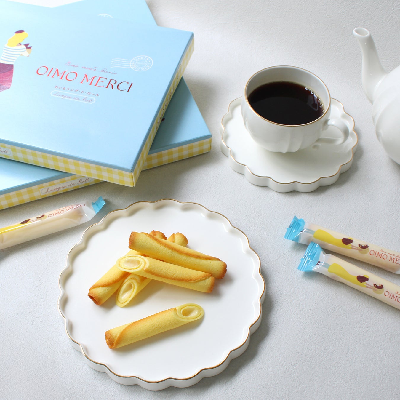 しっとりとした食感と濃厚な甘さが魅力の安納芋を使用したさくさく食感のラング生地で、ホワイトチョコレートをくるりと包みました。