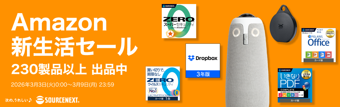 ソースネクスト株式会社(本社:東京都千代田区三番町3-8 泉館三番町3階 代表取締役社長:小嶋 智彰)は、3月3日(火)から3月9日(月)までの7日間、Amazon公式ストアおよびAmazon内のソースネクスト・ブランドストアページで開催される「Amazon 新生活セール」(先行セール含む)に、弊社の人気製品230製品以上を最大80%割引で提供することをお知らせいたします。