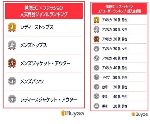 ファッション分野では、レディス・メンズともにアパレルのトップスが人気です。国・年代・性別ごとに購入者をセグメントし、セグメントの購入金額をもとにしたコアユーザーランキングでは、アメリカの20~40代の男女が上位を独占する結果となりました。