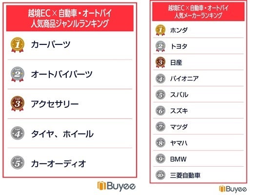 自動車・オートバイの分野では、カーパーツが人気です。外装品や内装品、エンジン部品などが購入されています。人気メーカーランキングではホンダ、トヨタ、日産など自動車メーカーに続き、4位にカーナビゲーションを販売するパイオニアがランクインしました。