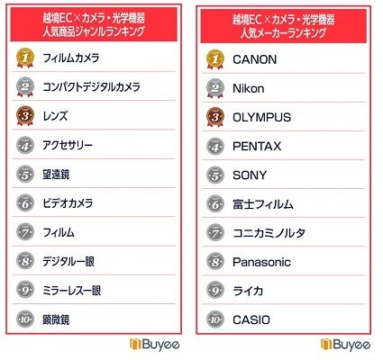 カメラ・光学機器の商品分野では、フィルムカメラが最も売れています。次いでコンパクトデジタルカメラ、レンズという結果になりました。メーカーとしてはCANON、Nikon、OLYMPUSなどの人気が高く、人気メーカーランキングでは、上位10社のうちライカを除く9社が日本メーカーでした。