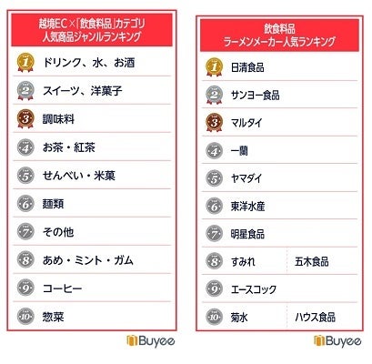 飲食品全体では海外輸出も好調なお酒や調味料、お茶が上位にランクインする結果となりました。訪日インバウンドにも人気の高いラーメン分野については、越境ECでの人気ランキングでは、大手の日清食品、サンヨー食品に続き、マルタイ、一蘭、ヤマダイがトップ5にランクインしました。