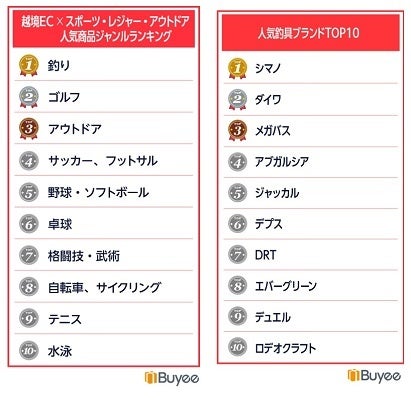 スポーツ・レジャー・アウトドアでは、釣り分野の商品が人気です。釣り具の人気ブランドランキングでは、シマノ、ダイワ、メガバスなど日本ブランドが、4位のアブガルシアを除きトップ10中9つを占めました。