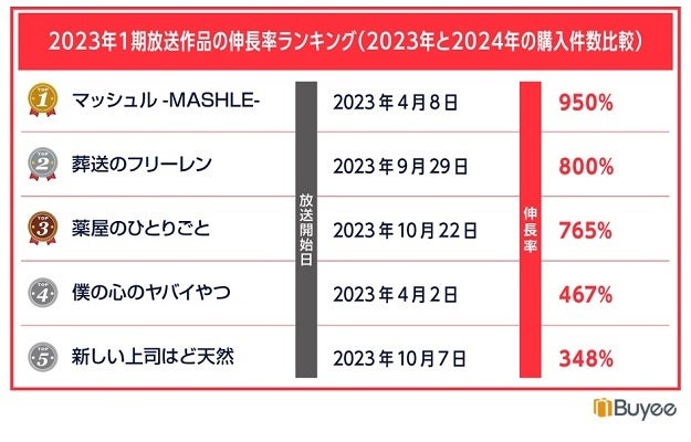 2023年に第1期が放送されたアニメ作品のうち、2023年と2024年の購入件数を比較した伸長率ランキングではマッシュルが昨年比950%で1位となりました。1位から4位の作品は2024年まで放送期間がありますが、「新しい上司はど天然」は2023年に放送を終了しています。その後も海外のお客様には作品の人気が継続していることがわかります。