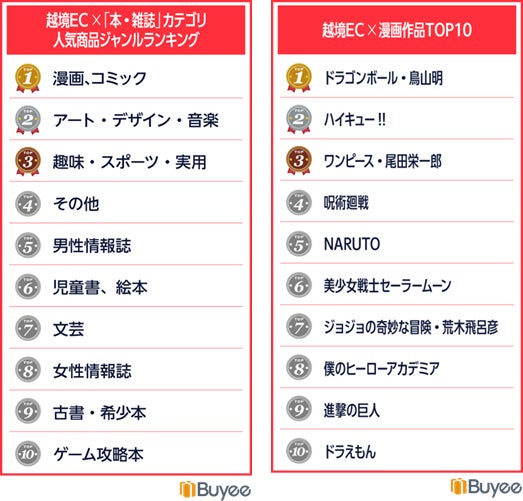 「本・雑誌」カテゴリでは「マンガ、コミック」が最も人気の商品ジャンルです。マンガの上位3作品の購入国は、「ドラゴンボール・鳥山明」がスペイン、「ハイキュー!!」が台湾、「ワンピース・尾田栄一郎」はアメリカから最も購入されており、国ごとに異なる作品が人気となっています。