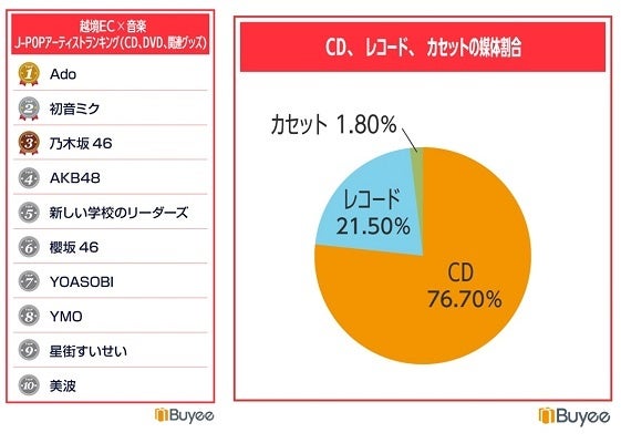 音楽のJ-POP分野では、Adoが最も人気でした。2024年8月に発表した上半期のランキングからの変化として、YMOや、シンガーソングライターの美波が新たにランクインしました。音楽分野のCD、レコード、カセットの購入割合では、レコードの購入件数が21.5%となりました。