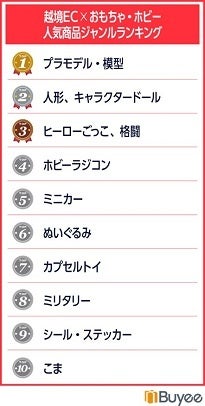 おもちゃ・ホビー分野ではガンプラやゾイドなどのシリーズが人気の「プラモデル・模型」が1位です。2位にはリカちゃん人形やドルフィードリームなどが人気の「人形、キャラクタードール」、3位は仮面ライダーシリーズやスーパー戦隊シリーズが人気の「ヒーローごっこ、格闘」という結果になりました。