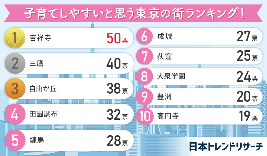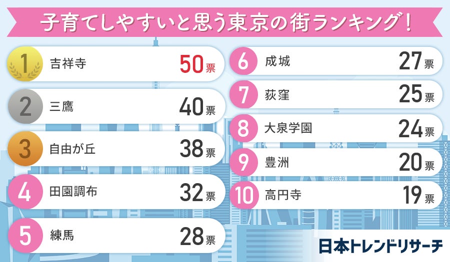 日本トレンドリサーチ(運営会社:株式会社NEXER)は、株式会社土地活用と共同で「子育てしやすいと思う東京の街」に関するアンケートを実施し、結果をサイト内にて公開したので紹介します。