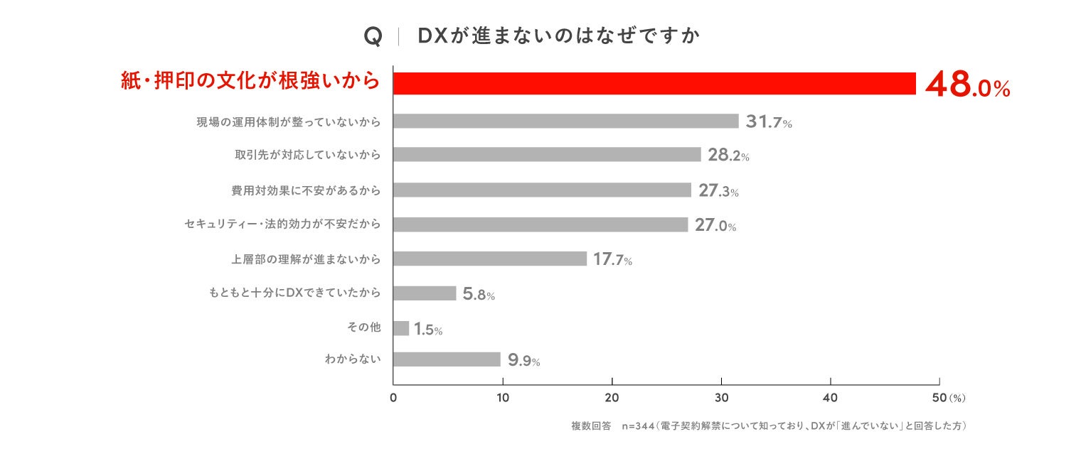DXが進まない理由としては「紙・押印の文化が根強いから」(48.0%)、「現場の運用体制が整っていないから」(31.7%)、「取引先が対応していないから」(28.2%)などが上位にあげられており、紙を使う文化が業界全体に浸透しているために、一気に紙から脱却することが難しい状況がうかがえます。