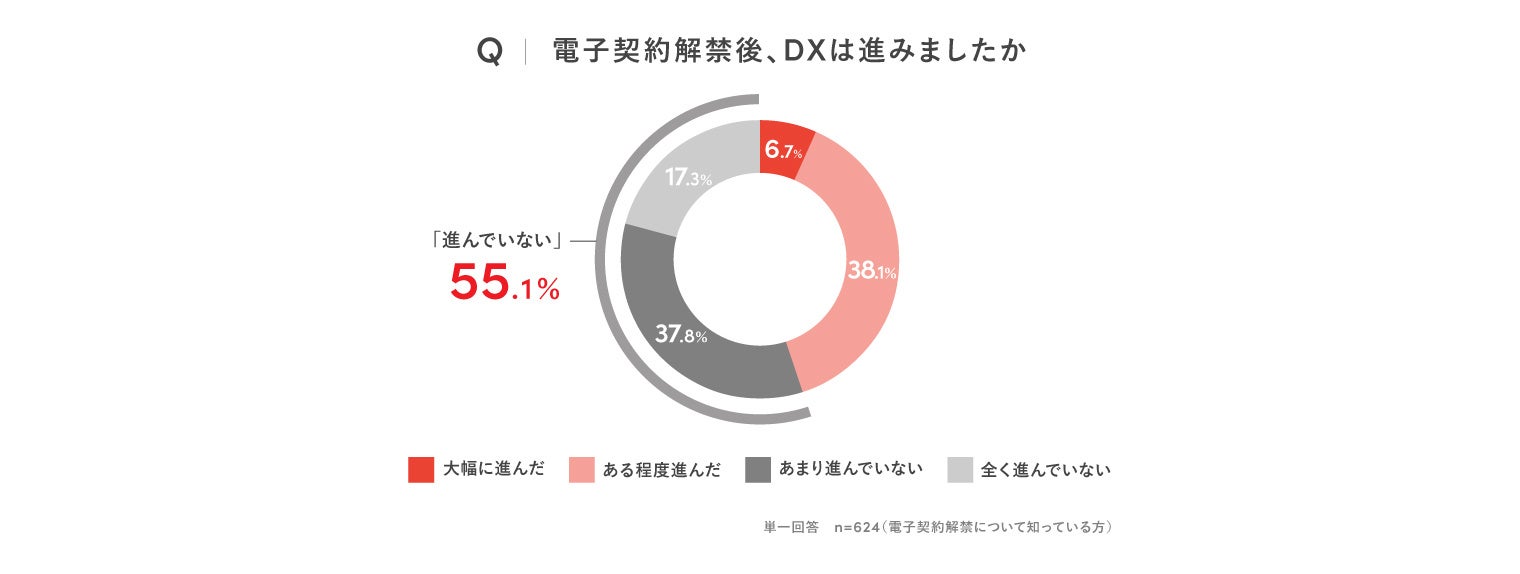 さらに、DX(電子契約や管理システムの導入)の状況については、「あまり進んでいない」(37.8%)、「全く進んでいない」(17.3%)を合わせて55.1%にのぼり、過半数の企業がDXの進展を実感できていない状況です。