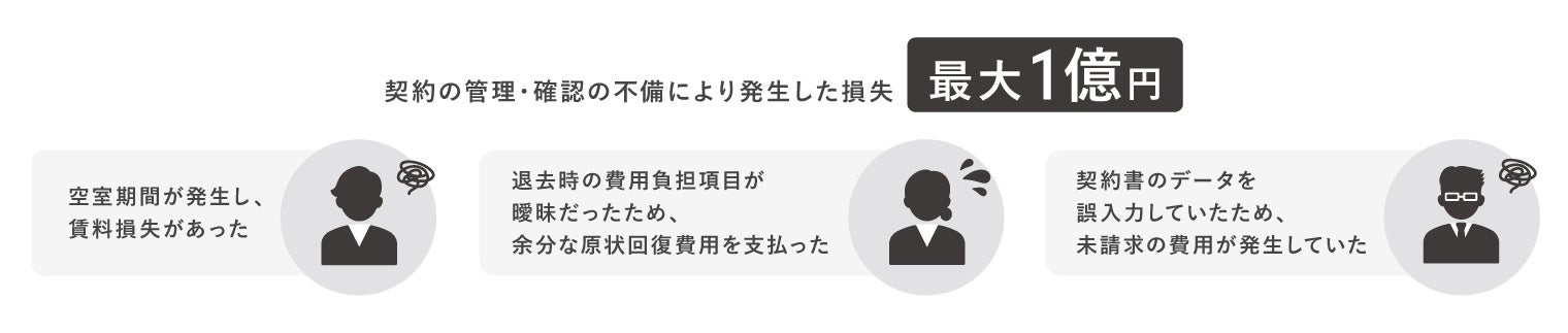 契約の管理・確認の不備で発生した具体的なトラブルとしては、「空室期間が発生し、賃料損失があった」「退去時の費用負担の項目が曖昧だったため、余分な原状回復費用を支払った」「契約書の原本データを誤入力していたため、数年にわたり未請求の費用が発生していた」などが挙げられました。