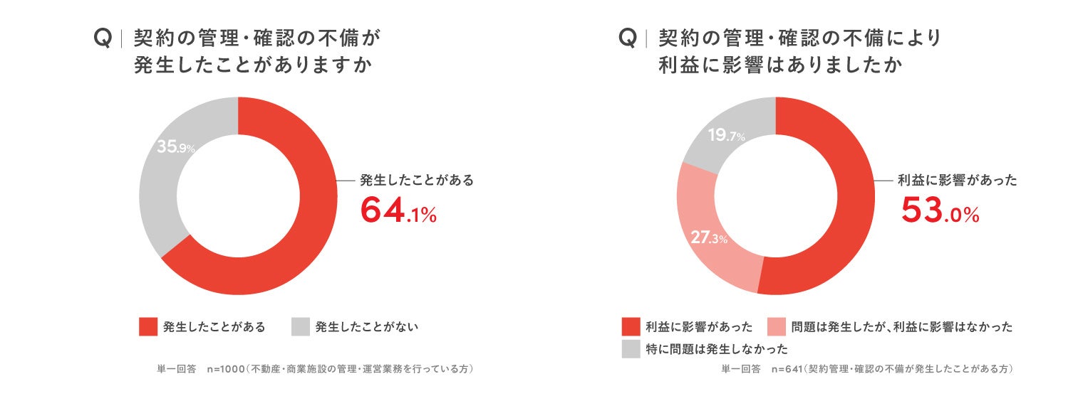 不動産や商業施設の管理・運営業務を担当する会社員に、勤めている会社で契約の管理・確認に不備が発生した経験の有無を尋ねたところ、64.1%が「発生したことがある」と回答しました。また、こうした不備によって、53.0%が「利益に影響があった」と回答し、契約業務上のミスが企業の利益にも影響を及ぼしている実態が浮き彫りとなりました。