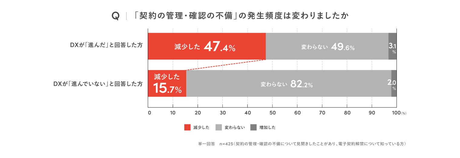 今回の調査では、法改正以降にDXが進展している企業とそうではない企業との二極化が見られ、DXが進展している企業では契約の管理・確認の不備が減少する傾向が明らかになりました。一方で、DXが進んでいない企業では、紙・押印の文化や取引先の対応状況など、自社の意向だけでは完全な電子化が難しいという課題も浮き彫りとなっています。