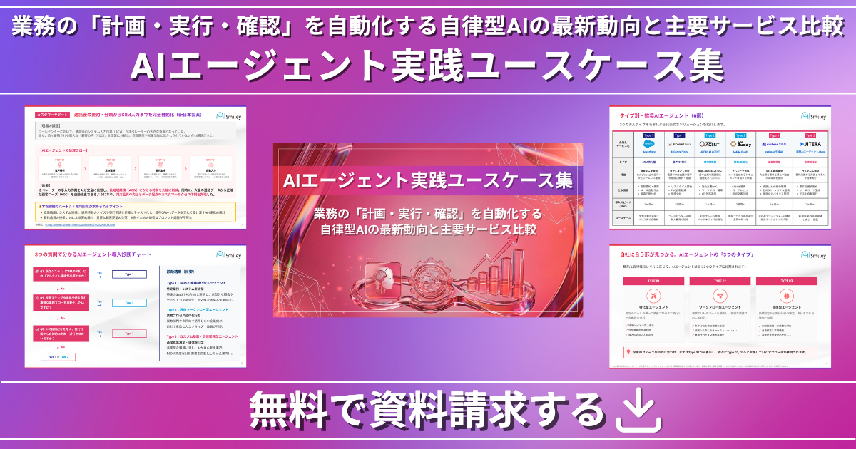 そこでAIsmileyは、単なる概念の紹介にとどまらず、現場での具体的な処理フローから、エージェントの選定、定着、全社展開へと至るロードマップを描くための実践書として、本資料を作成しました。