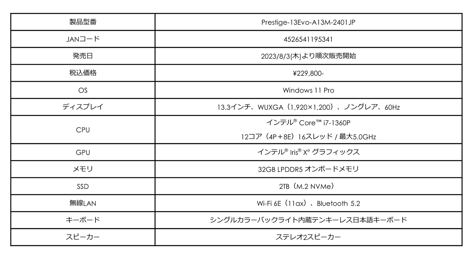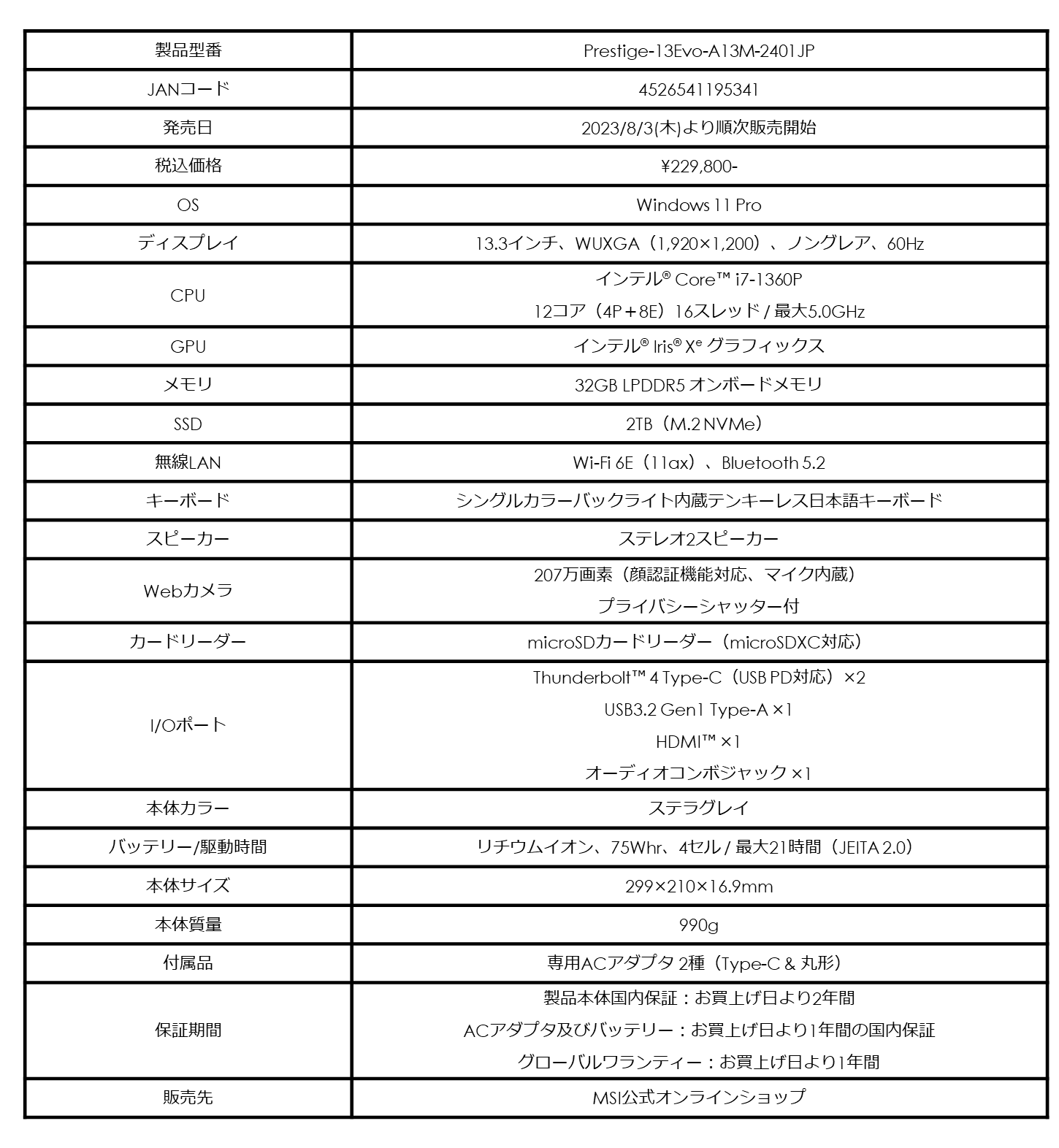 990gの超軽量本体にCore™ i7と大容量32GBメモリ搭載パワフルビジネスノートMSIストア限定モデル「Prestige-13Evo-A13M-2401JP」発売