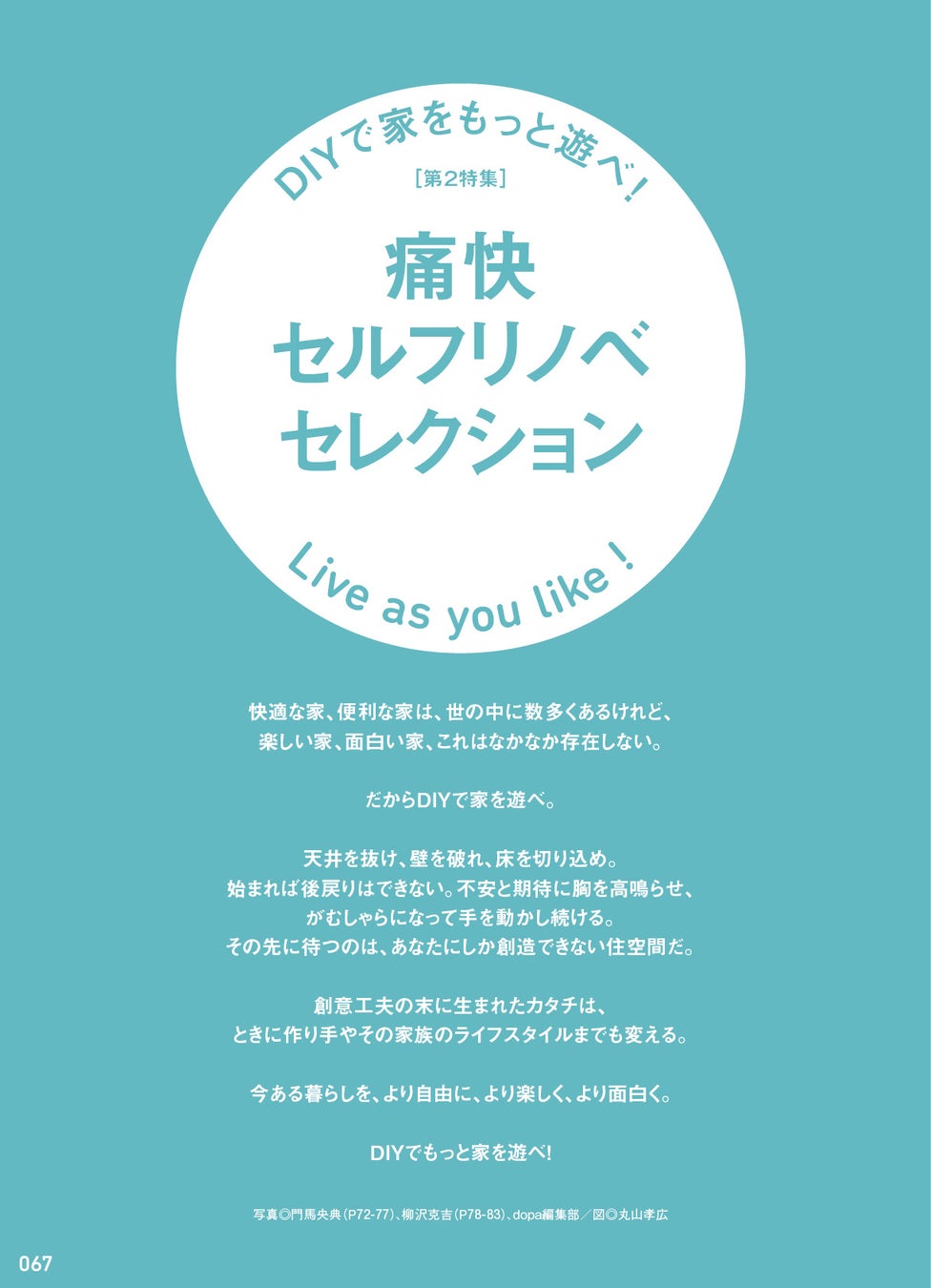 第2特集は、現代住宅のセルフリノベーションにズームアップ! リビングを真っ二つに割った大胆な土間空間から、家族で楽しめる屋根裏秘密基地、大容量の高床収納など、DIYだからこそ実現した、遊び心あふれるリノベ作品が勢揃い。DIYで暮らしをもっと楽しく、もっと自由に。dopaはDIYで家を遊ぶことを提案します。