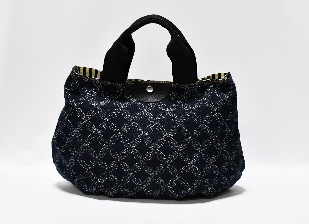 今回は刺し子風のデニムが様々なスタイルに合わせやすい丸型のかわいらしいバルーンバッグをご用意いたします。