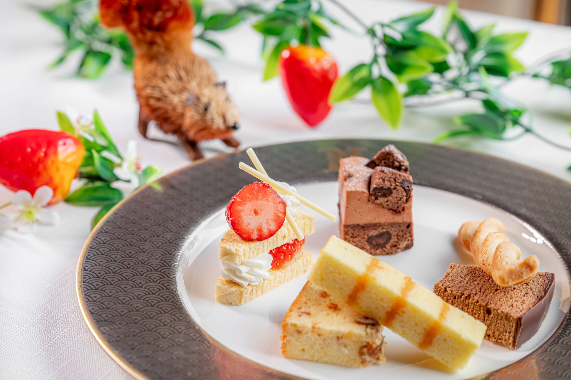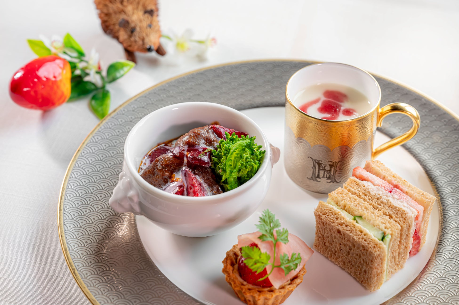 ホテルシェフ自慢のセイボリーは4品すべてに苺を使用いたしました。苺の爽やかな酸味と牛肉の旨味がマッチした「苺香る牛肉の赤ワイン煮込み」や生ハムの塩味と苺の組み合わせが癖になる「苺、生ハム、奈良漬けクリームチーズのタルト」など、苺の特徴を活かしたメニューをお楽しみいただけます。