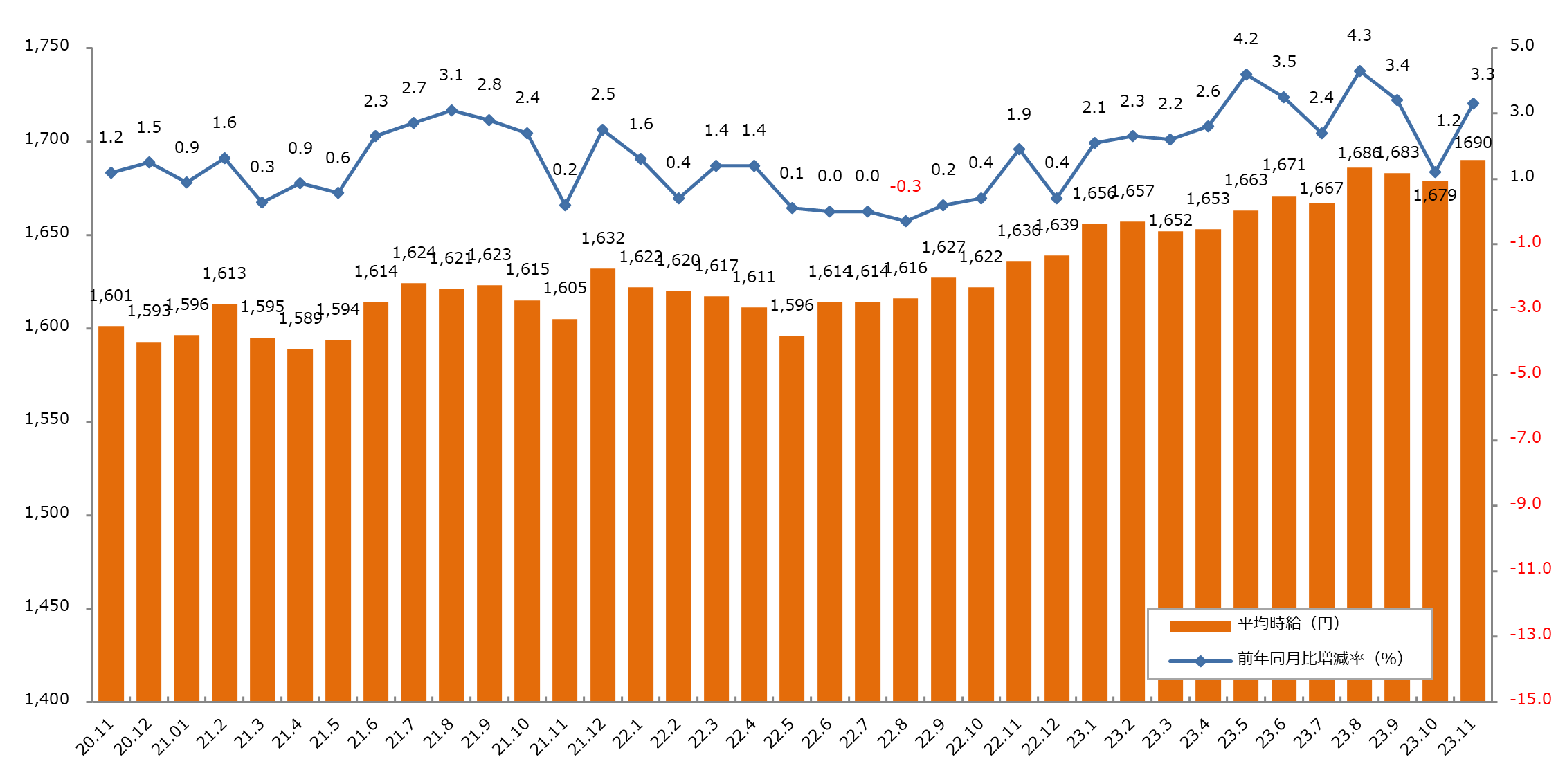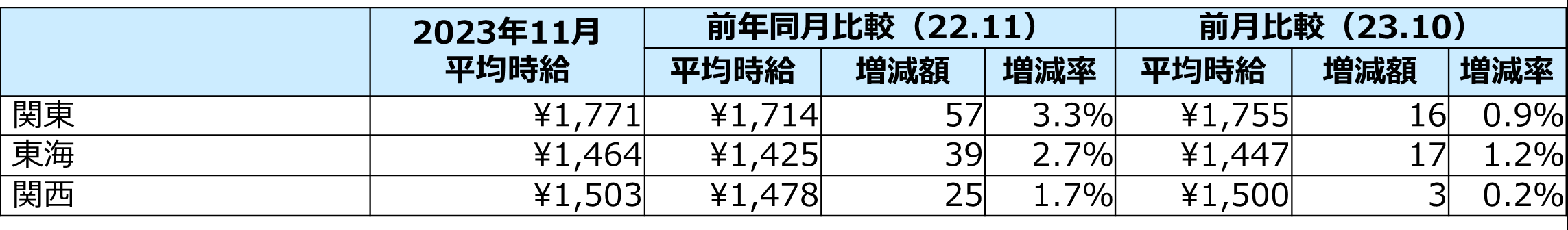 2023年11月度の三大都市圏平均時給は1,690円(前月比+11円・0.7%増、前年同月比+54円・3.3%増)で、3ヵ月ぶりに過去最高時給を更新しました。平均時給の上昇には「自動車の生産台数の増加」が影響しています。