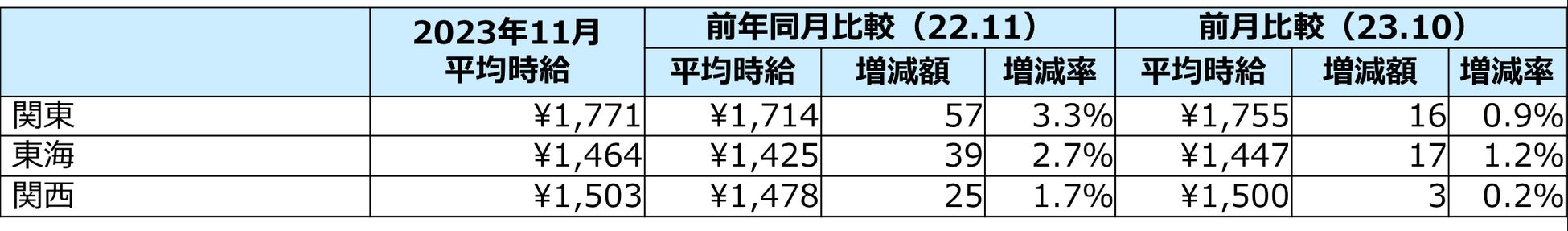 11月度のエリア別平均時給は、全エリアで前年同月比プラスを記録。