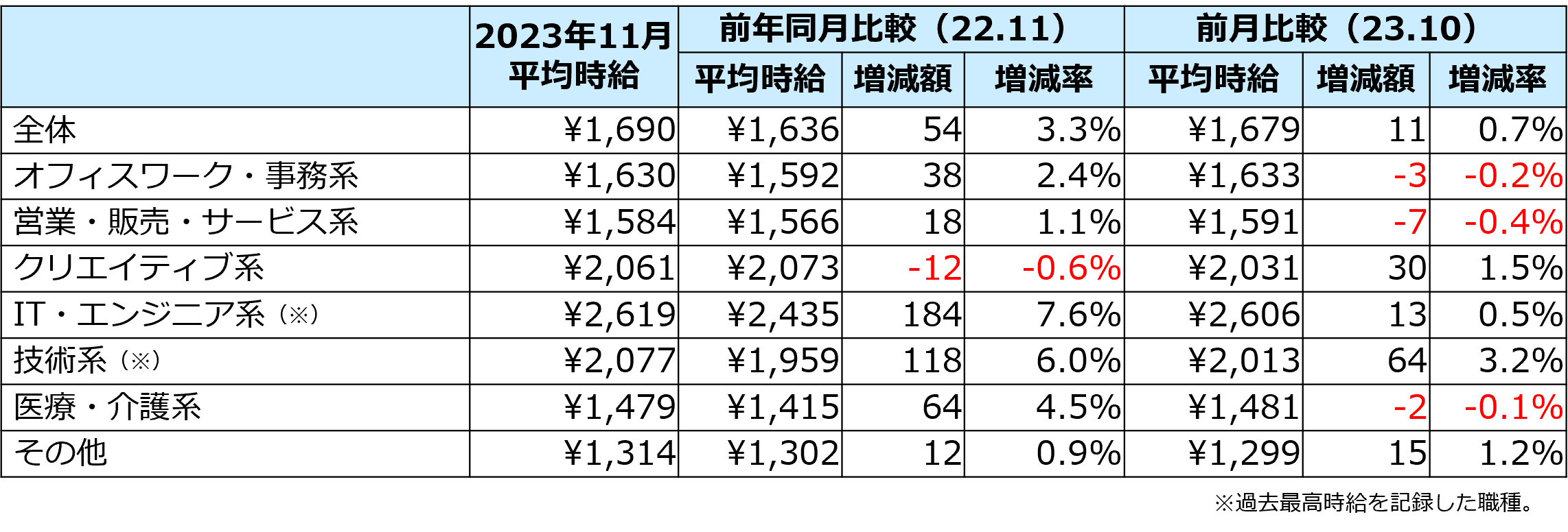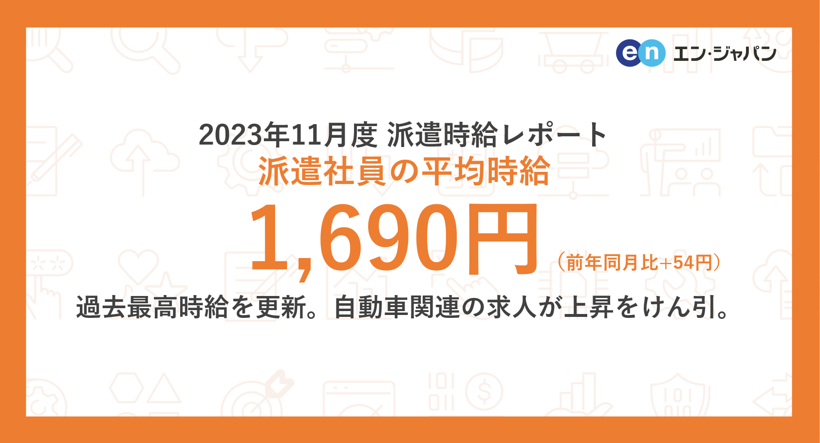 2023年11月度 派遣社員の平均時給は1,690円過去10年間で最高時給を更新。IT系、技術系にて、自動車関連の求人が上昇をけん引。