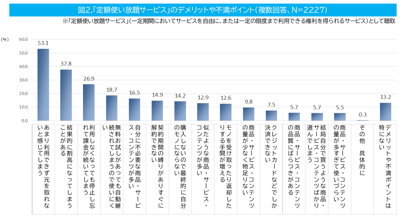 生活者が感じるサブスクリプション型サービスのデメリットや不満点を尋ねたところ、上位4つは支払いに関することが並びました。「あまり利用できず元を取れないと感じてしまう」(53.1%)、「結果的に割高になってしまうことがある」(37.8%)といった支払額への納得感や、「利用しなくなっても停止し忘れて課金が続いてしまう」(26.9%)、「無料お試しがあっても自動継続されてしまうので使いにくい」(18.7%)など支払いに関わる契約手続きに対してデメリットや不満点を感じることが多いようです。「デメリットや不満ポイントは特にない」との回答は13.2%でした。