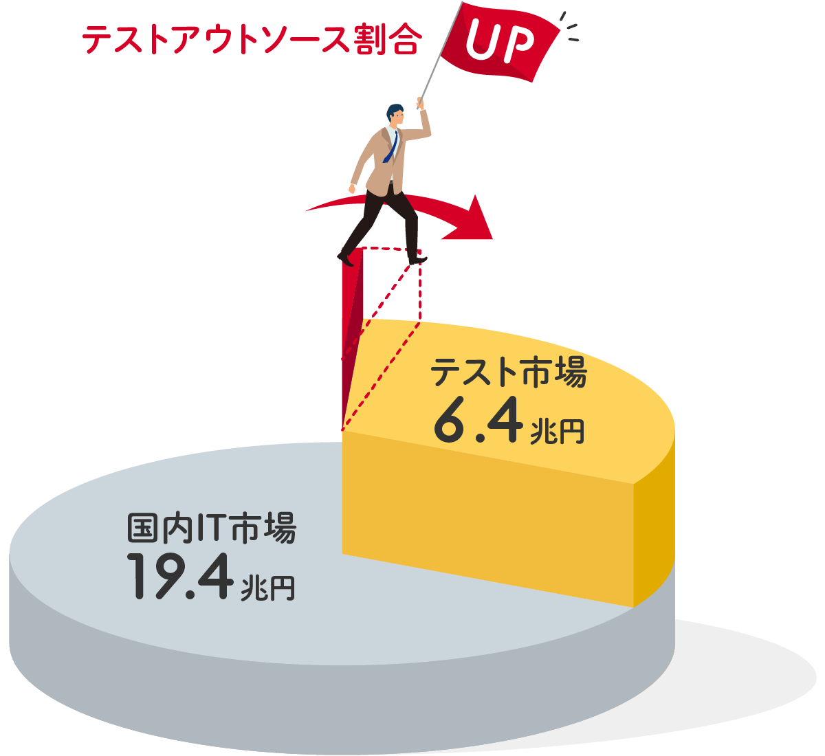 2023年には、国内IT市場19.4兆円*1に対してテスト市場は6.4兆円*2 になると予測されています。また、テスト市場のうち、アウトソースされる割合は国内においてはわずかであり、今後大きく拡大すると想定されます。