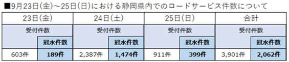 JAF(一般社団法人日本自動車連盟 会長 坂口正芳)は、台風15号の影響で実施したロードサービス救援件数のうち、要請の多かった静岡県の冠水件数をまとめ公開しました。