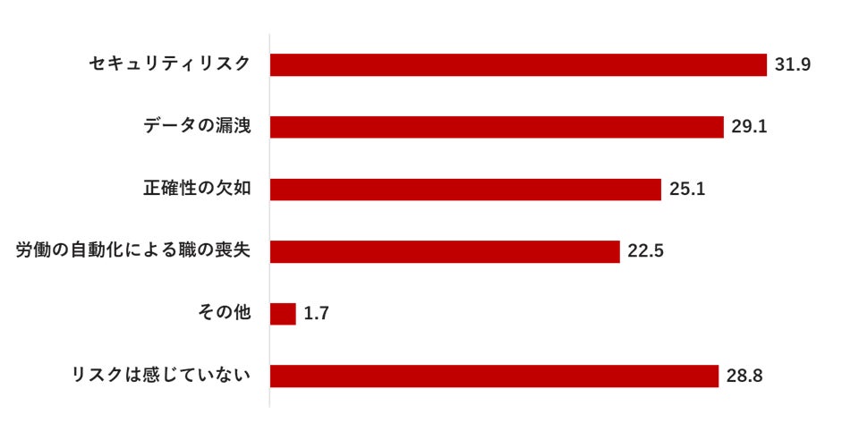 一方、生成AIが仕事にもたらすリスクのトップ3は「セキュリティリスク」「データの漏洩」「正確性の欠如」であった。また、「リスクは感じていない」が約3割となった。
