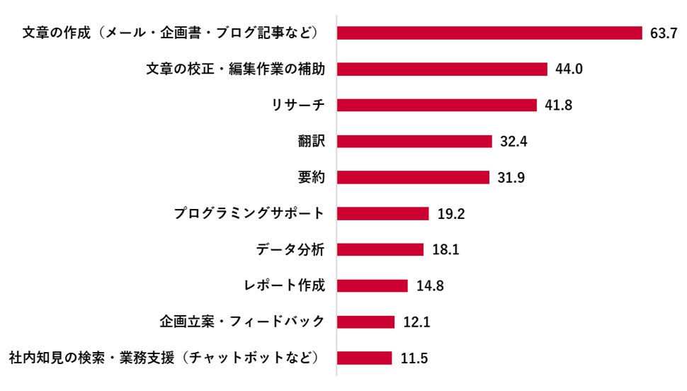 また、どのような業務で利用しているかについては、「文章の作成(メール・企画書・ブログ記事など)」が6割を超えトップ、「文章の校正・編集作業の補助」「リサーチ」が4割台で続いた。
