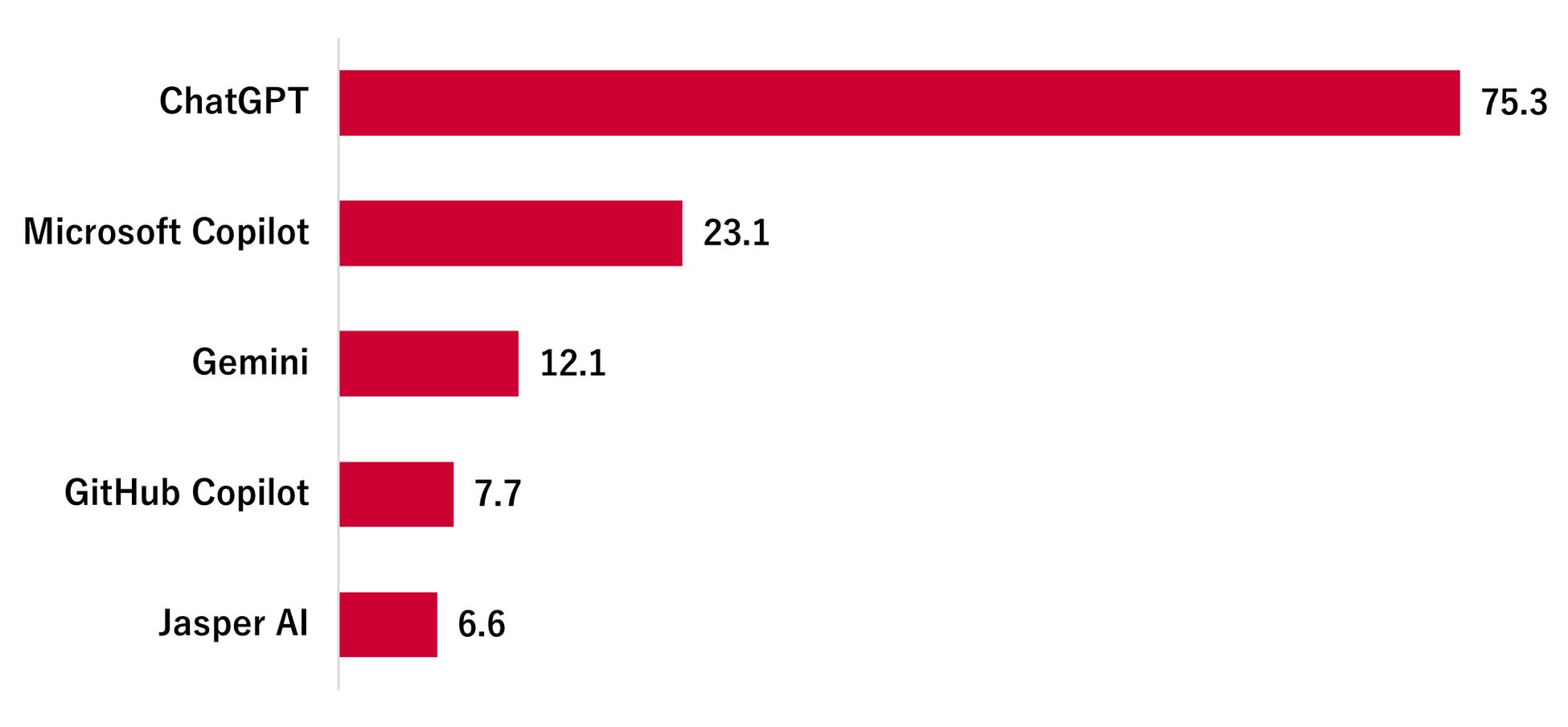 利用している生成AIツールやプラットフォームを聴取したところ、「ChatGPT」が75.3%でトップだった。2位の「Microsoft Copilot」(23.1%)とは50ポイント以上の差となった。