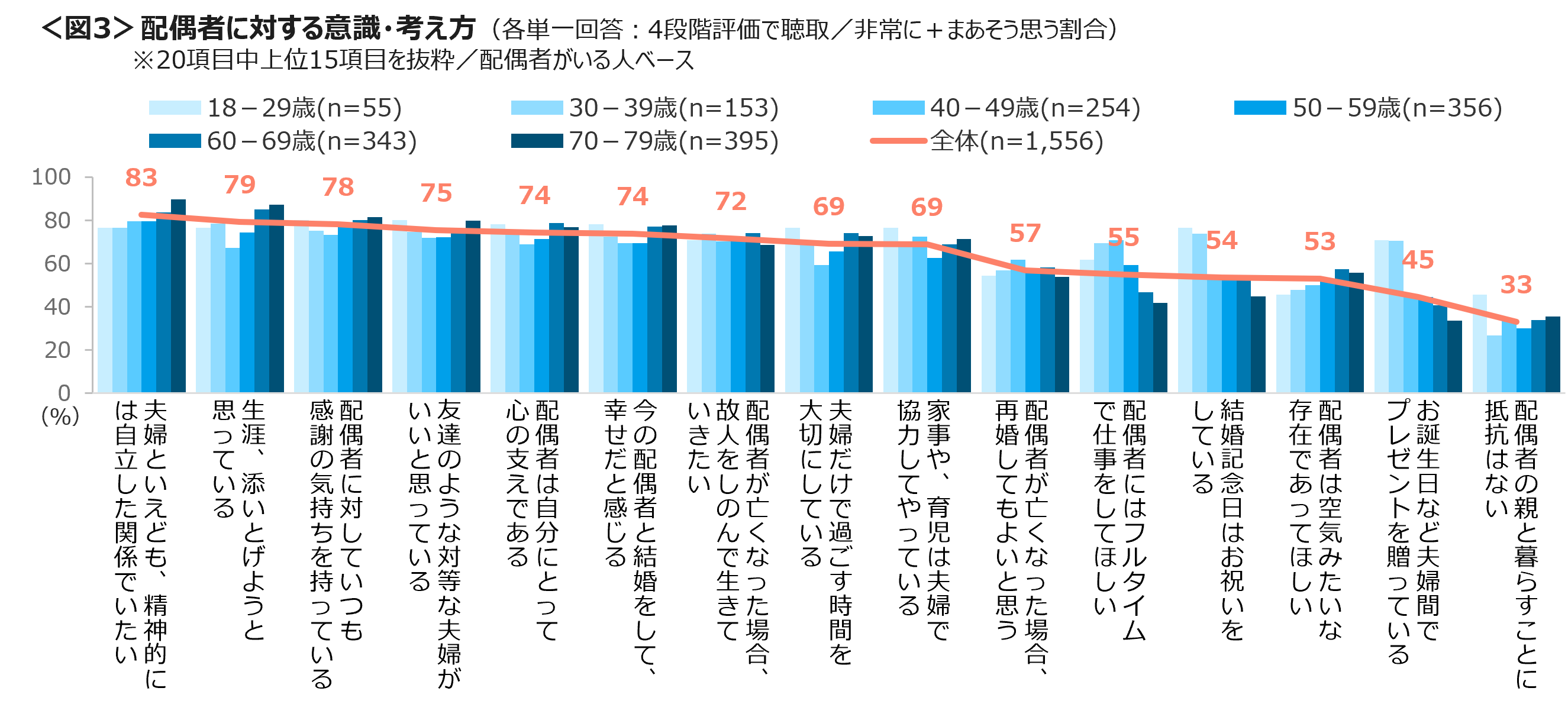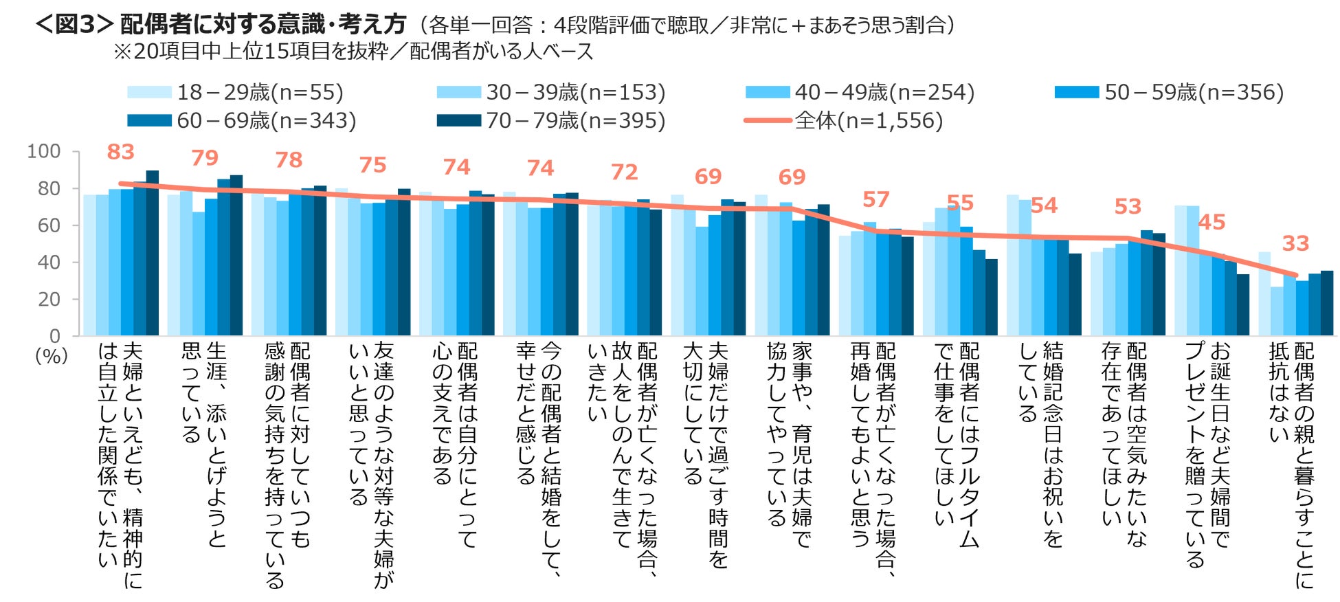 配偶者への意見・考え方で非常に+まあそう思う割合は、「夫婦といえども、精神的には自立した関係でいたい」83%、「生涯、添いとげようと思う」79%、「配偶者に対していつも感謝の気持ちを持っている」78%がTOP3。18~29歳と30代は「結婚記念日はお祝いをしている」「お誕生日など夫婦間でプレゼントを贈っている」が他世代より突出して高い。<図3>